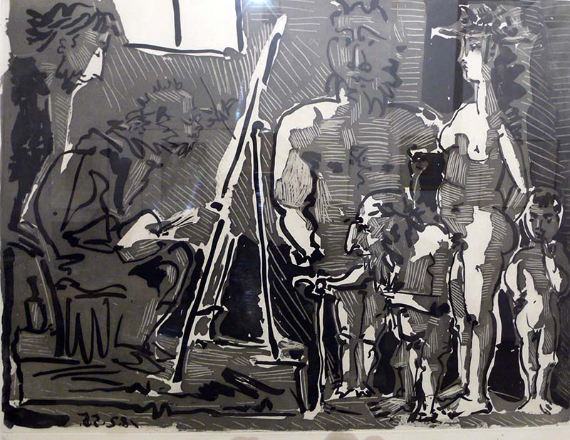 En la primera d’aquestes exposicions hi trobem el Picasso més atrevit i informal, el qual, fent gala del seu domini del dibuix, ens mostra les perspectives eròtiques, burlesques o escandaloses d’uns personatges de ficció que s’encadellen amb la figura del pintor. Són dibuixos sobre gravat, amb tècniques d’aiguafort, aiguatinta, punta seca, al sucre i litografies, en els que el traç crea les formes d’una manera rotunda i lliure (Figs.1 i 2).