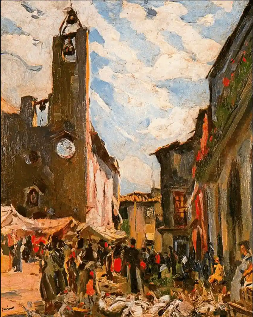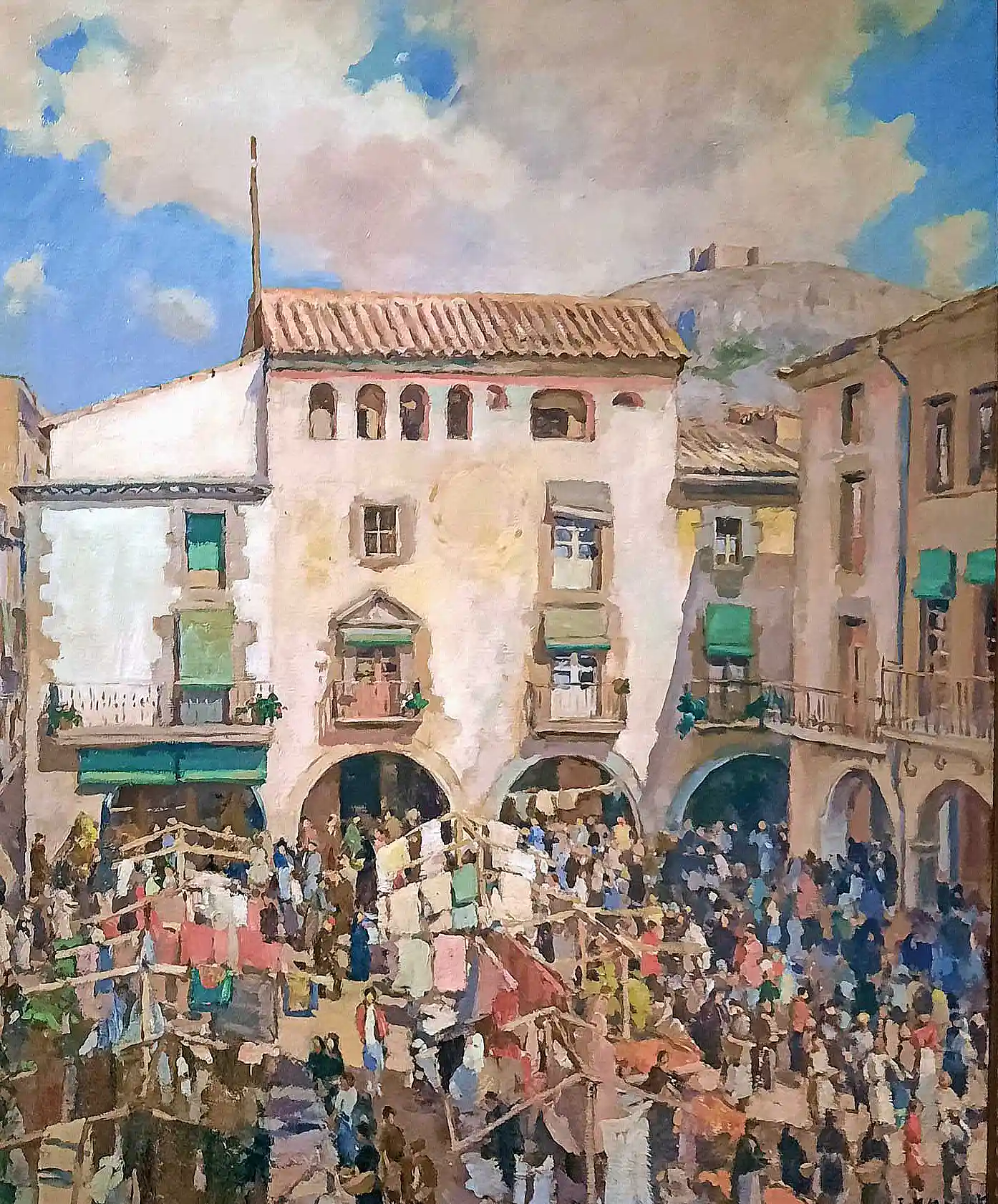 Ai, la plaça de la Vila! El centre neuràlgic del mercat i de la vida torroellenca, abans i ara. Potser és per això que l’estampa actual continua sent tan pintoresca com quan un dia de l’any 1935 la va pintar el gran Joaquim Mir (1873-1940), amb els tendals de les parades, la capella de Sant Antoni i una venedora d’aviram amb primer terme. Traç gruixut i colors vius i una estampa perfecta. Com la que també va plasmar el torroellenc Josep Maria Mascort (1890-1947), amb el castell al fons presidint una plaça en plena ebullició. És la postguerra, però, malgrat les penúries i la repressió, encara hi ha color.