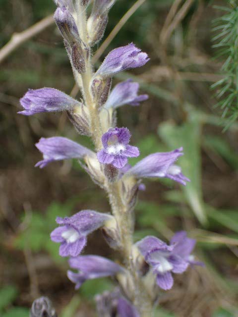 El puig de la Fonollera (5) és una petita elevació costanera que antigament estava cultivada amb olivars però que ha retornat a l’estat salvatge. Hi hem pogut descobrir, al peu dels arbusts, en unes petites clarianes, una desena de frares blaus (Phelipanche mutelii var. mutelii) (n). També se’n va trobar un sol peu aïllat a la muntanya d’Ullà. La determinació va ser confirmada per Holger Uhlich, expert en aquest gènere, que relaciona la varietat nana amb P. mutelii. Floreix de final d’abril a principi de maig. De la varietat nana, que havia estat citada al Montgrí [1] amb el nom d’Orobanche ramosa subsp. nana, se’n van trobar dos peus al puig de la Fonollera, en una petita clariana a un centenar de metres del grup de plantes de la varietat mutelii. En una altra clariana es van trobar algunes desenes de Valerianella pumila (n), juntament amb V. muricata, en floració de final d’abril a principi de maig.