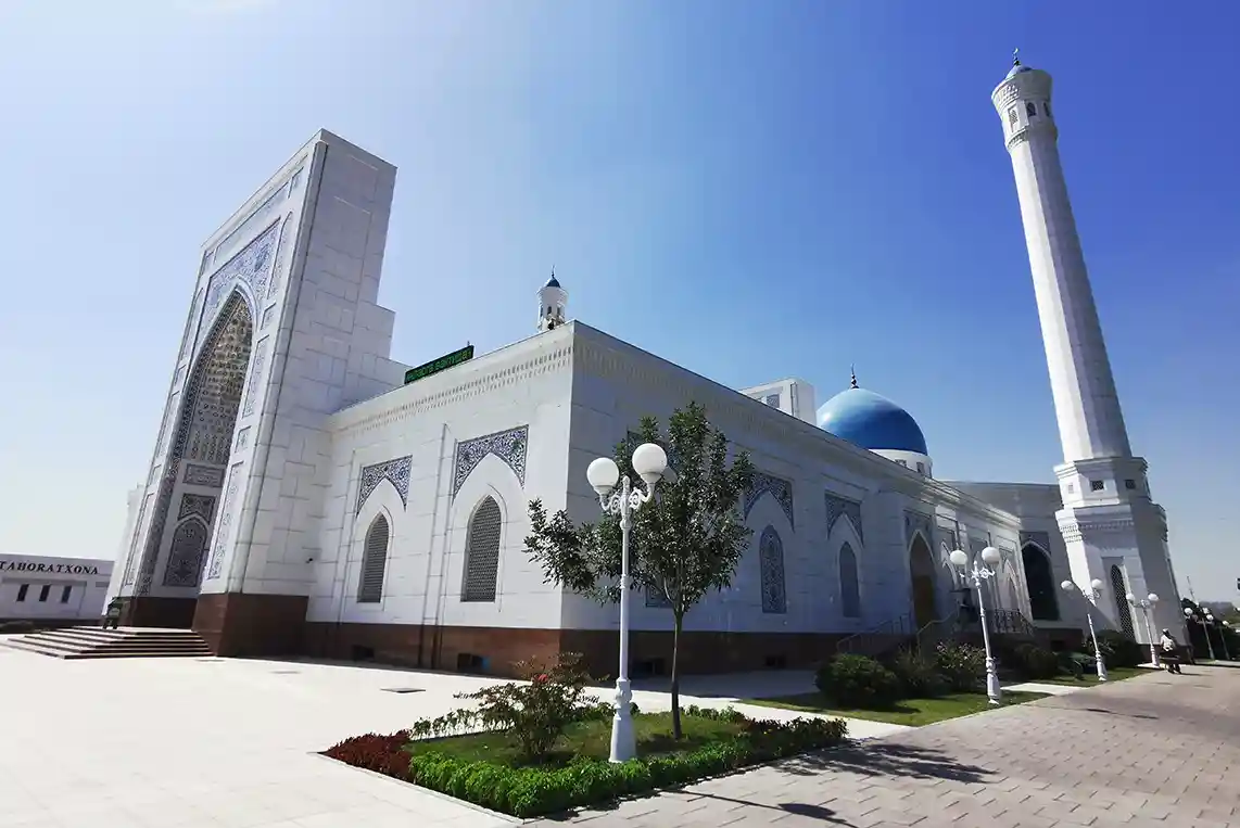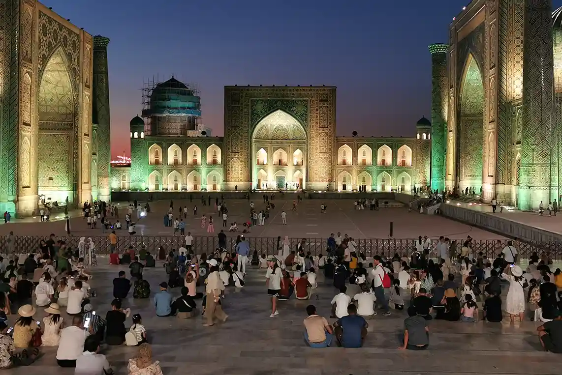 En aquest país les madrasses, les mesquites, els palaus i els mausoleus mostren la monumentalitat de l’arquitectura musulmana. El color turquesa de la ceràmica de les rajoles és el que predomina en minarets, façanes i cúpules. Tonalitats diferents de verds i blaus conformen l’ornamentació amb formes vegetals i geomètriques. Els conjunts arquitectònics són impressionants, entre els que destaquen les tres madrasses de la plaça de Registan de Samarcanda: la madrassa d’Ulugh Beg, la madrassa de Tilya-Kori i la madrassa de Sher-Dor. A la nit hi ha un espectacle de formes, llums i colors sobre les façanes on s’explica la història del lloc.